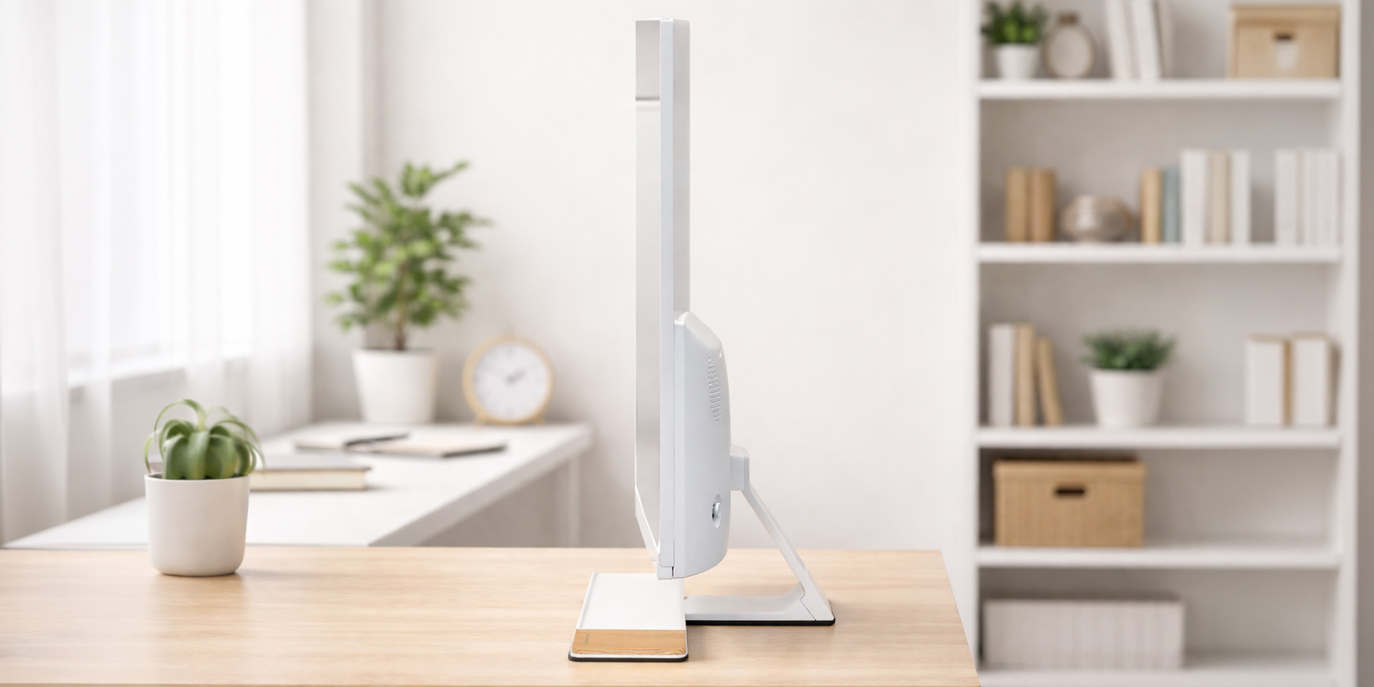 最薄部約8mmのスリムボディと極薄フレーム、白を基調としたデザイン。